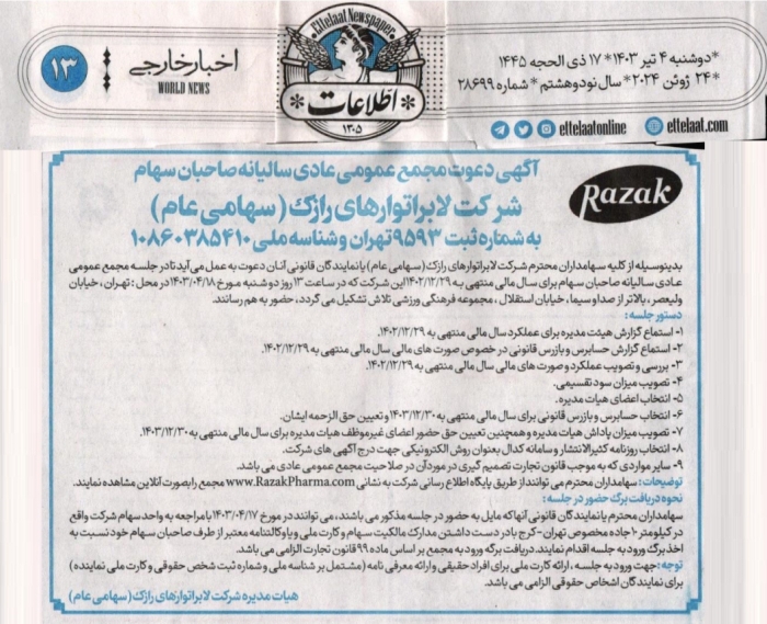 به گزارش روابط عمومی لابراتوارهای رازک ، مجمع عمومی عادی سالیانه...